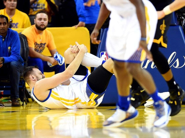 Warriors center Andrew Bogut (12) reacts after being injured during