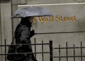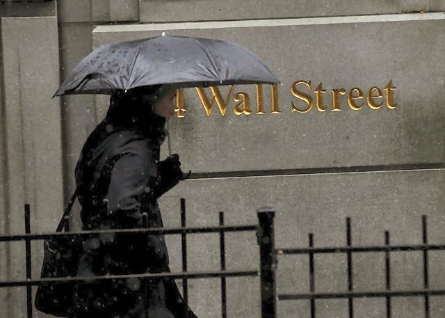 A man carries an umbrella during a morning snow fall on Wall St. in