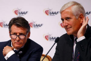 IAAF President Sebastian Coe (L) and Rune Andersen, head of the IAAF