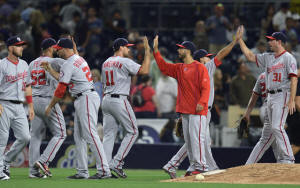 The Washington Nationals celebrate a 7-5 win over the San Diego