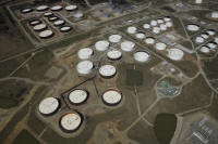 tanks are seen from above at the Cushing oil hub, in Cushing,