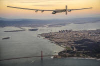 Piccard of Switzerland, flies over the Golden Gate bridge in