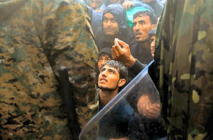 Migrants and refugees beg Macedonian policemen to allow passage to