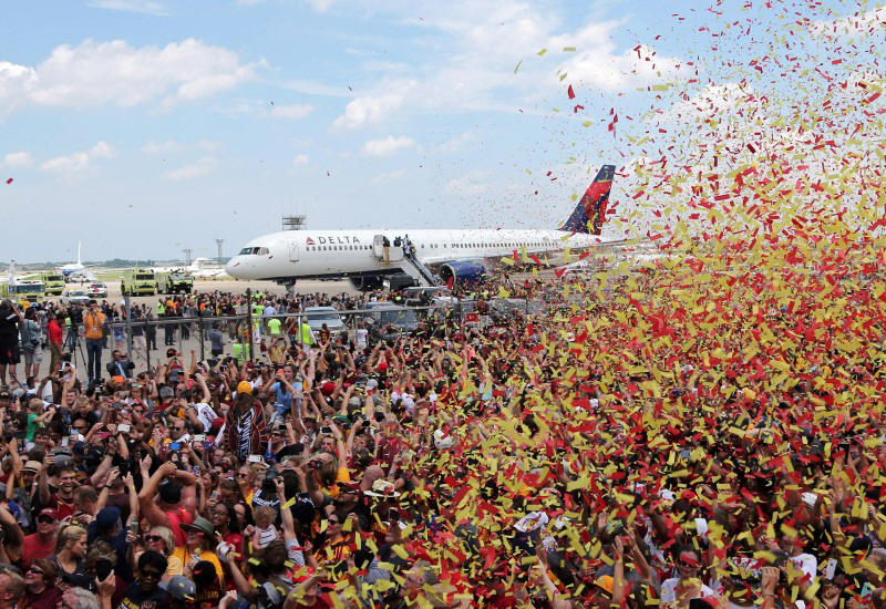 James at a welcome party held at the airport in Cleveland, Ohio,