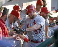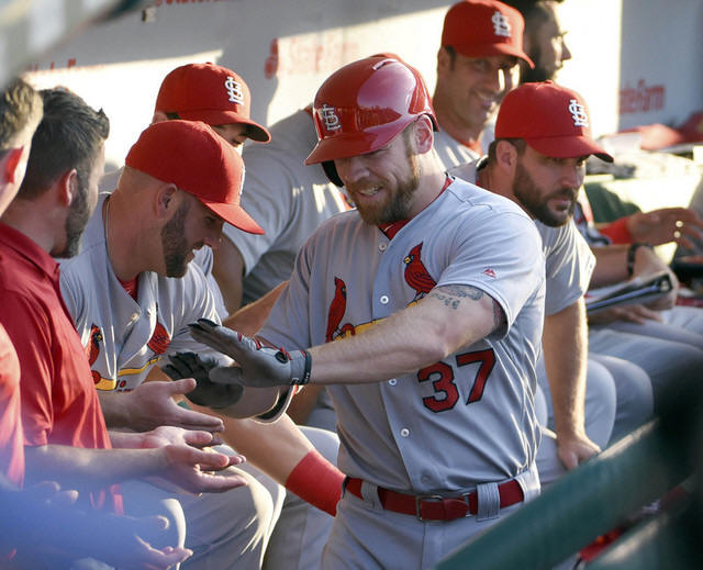 Cardinals first baseman Brandon Moss (37) is greeted by