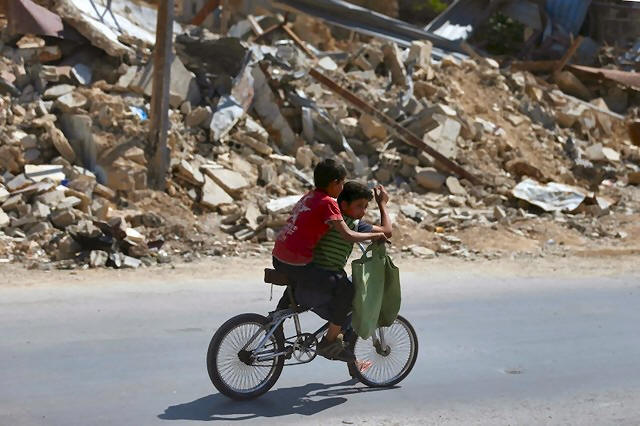 Boys ride a bicycle near rubble of damaged buildings, in the rebel
