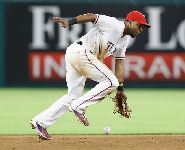 Rangers shortstop Elvis Andrus (1) is unable to field the single by