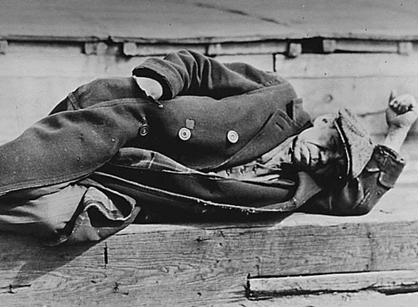 An unemployed man in an old coat is seen lying down on a pier in the