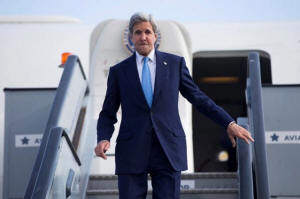 Secretary of State John Kerry steps off his plane after arriving at