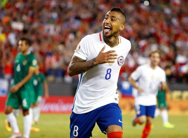 Chile midfielder Arturo Vidal (8) celebrates his penalty kick goal