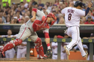 Twins catcher Kurt Suzuki (8) scores a run before Philadelphia