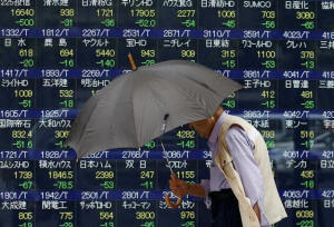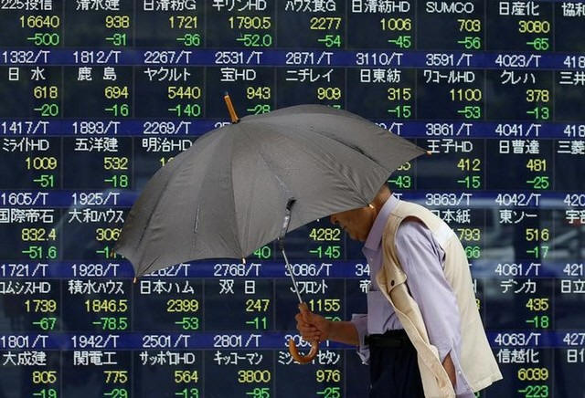 A pedestrian holding an umbrella walks past a stock quotation board