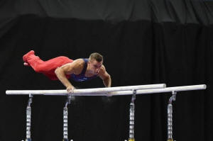 Sam Mikulak competes on the parallel bars during the 2016 USA
