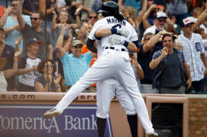 Tigers Cameron Maybin (4) is lifted up by second baseman Ian Kinsler