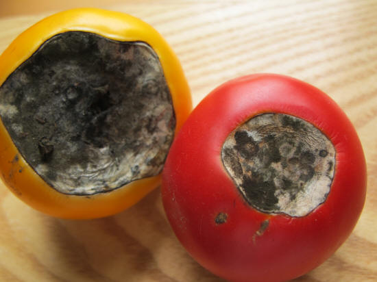 It begins as light tan water-soaked lesion on the blossom end of the fruit. The lesions enlarge and turn black and leathery. This can drastically lower the yield and lower marketability of the fruits. Fluctuating soil moisture supply during the dry periods, and low calcium levels in the fruit are the major causal factors. Control of blossom end rot consists of providing adequate moisture from fruit formation to maturity, and use of mulch (grass clippings, plastic, straw, shredded newspapers, or plastic) to conserve moisture and even out the moisture supply. If you don’t have a mulch in place now, it is best to apply soon to prevent problems. Also, avoid frequent shallow watering. Water deep and then wait five or more days before watering again. This is one reason this problem is very common in container grown tomatoes.