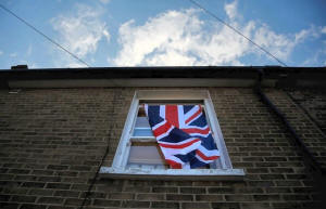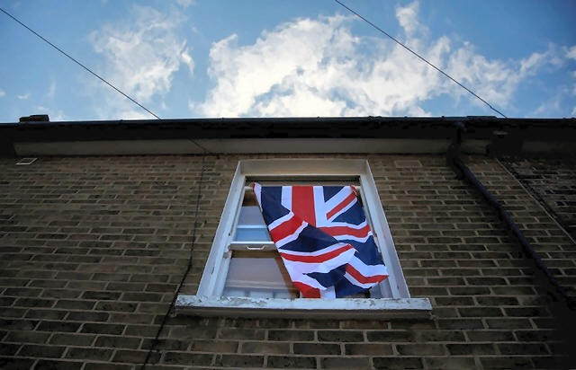 A British flag flutters in front of a window in London, Britain,