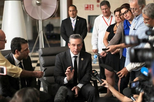 Puerto Rico's Governor Alejandro Garcia Padilla (C) talks to