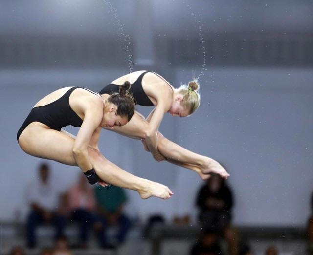 Samantha Bromberg and Delaney Schnell dive in the synchronized
