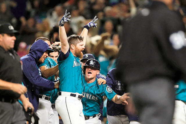 Mariners designated hitter Adam Lind (26) celebrates with teammates