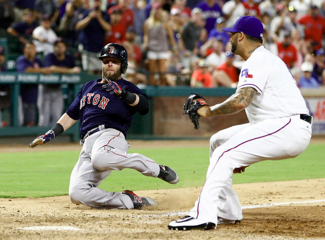 Red Sox second baseman Dustin Pedroia (left) slides home for the