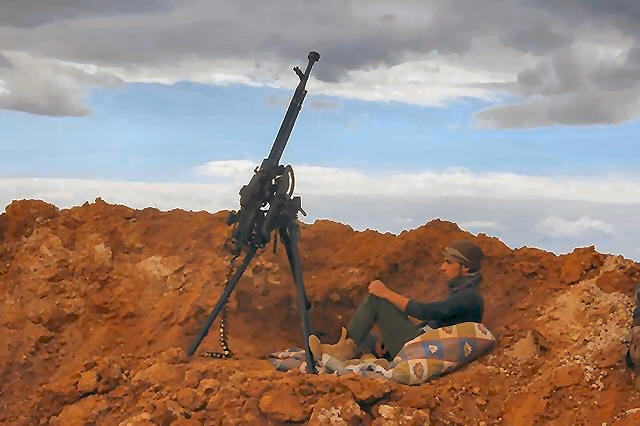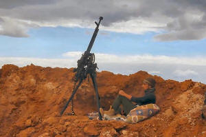 A rebel fighter sits near a weapon in Al-Lataminah village, northern