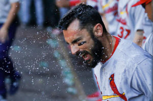 Cardinals second baseman Matt Carpenter (13) after being splashed
