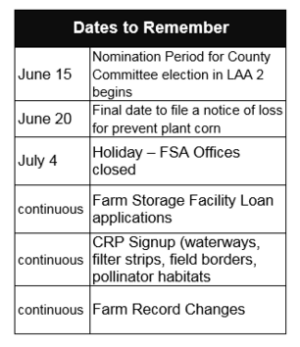 The nomination period for the all FSA county committees begins on June 15, 2016. Nomination forms must be postmarked or received in the County FSA Office by close of business on Aug. 1, 2016.