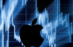 A 3D printed Apple logo is seen in front of a displayed stock graph in