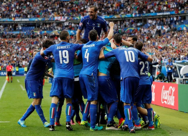 Italy's Graziano Pelle celebrates with teammates after scoring their