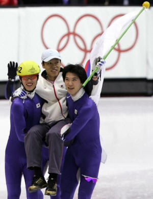 Seo Ho-Jin (242) and Oh Se-Jong (R) of South Korea carry their coach Song Jae-Kenn after the men's 5000 metres short track speed skating relay final at the Torino 2006 Winter Olympic Games in Turin, Italy, February 25, 2006. |
