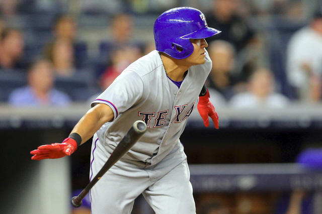 Rangers right fielder Shin-Soo Choo (17) hits a two run single