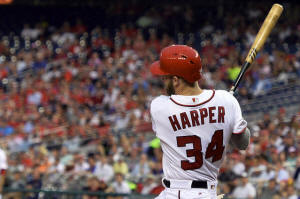 Nationals right fielder Bryce Harper (34) hits a rbi single during