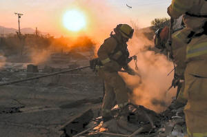 Firefighter Robert Aikman extinguishes a hot spot at a residence