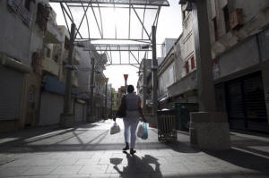 A woman carries bags while walking in a commercial area with stores