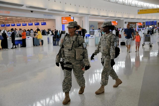 Members of the U.S. Army monitor the departures area at John F.