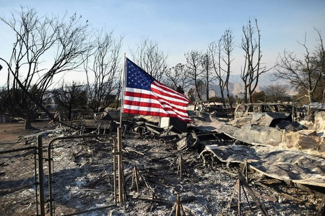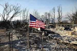 An American flag flies above wreckage at a residence leveled by the