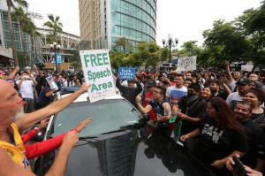 Trump supporters (L) and anti-Trump demonstrators clash on either