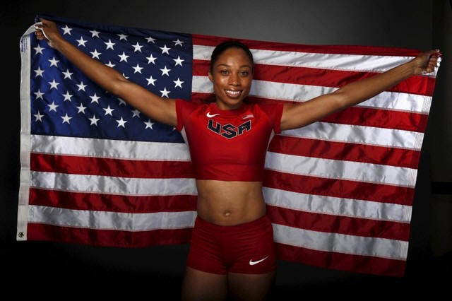 Runner Allyson Felix poses for a portrait with the U.S. flag at the