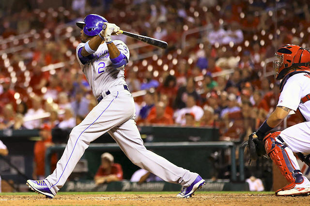 Royals shortstop Alcides Escobar (2) hits an RBI double to right
