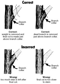 Branch tips can be cut back to a bud, and entire branches can be cut back to another branch or the main trunk. When making the cut to a branch or trunk, cut to the edge of the collar (about a 1/16 of an inch from the other branch). Cutting too close to the other branch destroys the water carrying tissue, and leaving a stub will guarantee a rotten branch stub (that will eventually rot into the main branch or trunk). Topping a tree lessens weight, and reduces size, for a short period of time. Within five years of topping, you will generally have more weight and growth than you would have had without topping. If you are making cuts on large branches, it is best to cut once about 18 inches from the main branch, then make a second cut to leave the 1/16 inch collar. This will help prevent the cut branch from tearing other branches.