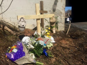 flowers, wooden crosses, and an oil driller's hard hat near the site