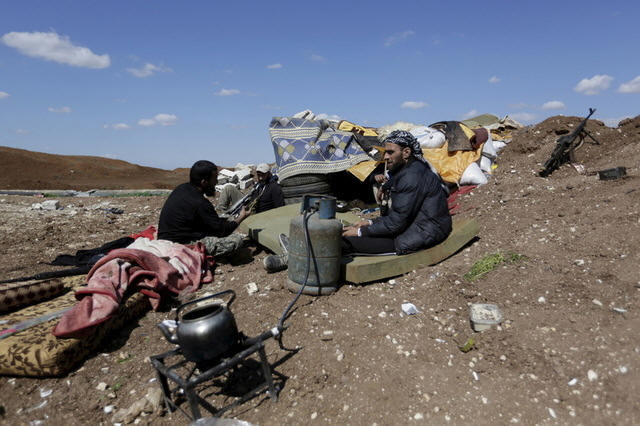 Rebel fighters from 'Jaysh al-Sunna' sit on a look-out point in