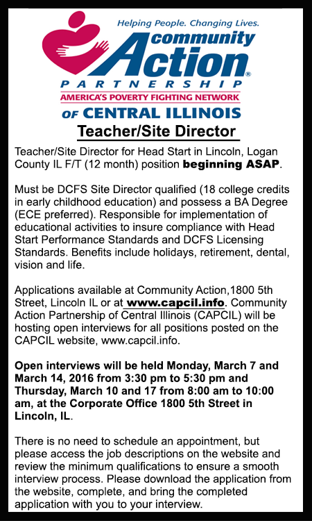 or in person at 601 Broadway St, Lincoln, IL. Deadline: March
