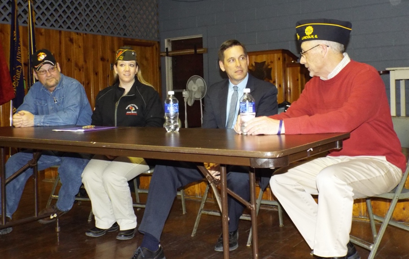 Left to right: Veterans Jack Bishop and Michelle Ramlow, Representative Tim Bulter, and veteran Joe Schlaer. Rep. Butler visited the Cronin Brother's VFW on Thursday evening to meet with members of the new Logan County Veteran's Assistance Commission. Butler listened to the group at the table and other commission members in the audience. He shared a story about his father who was a veteran. At the end of the evening, he said that he supported the group in their efforts to form the VAC as well as the work they have done to get a tax referendum passed. He told Schaler, "If I lived in Logan County, I would vote for this."