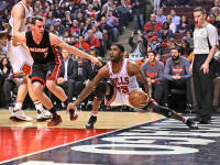 Bulls guard E'Twaun Moore (55) slips while driving around Miami