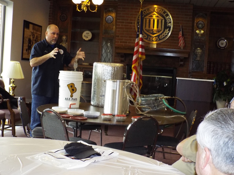 Troy Hanger of the Spirited Republic in Lincoln led a discussion on home brewing. He brought with him the equipment used in home brewing and explained how each piece was used to produce a homemade beer product. Hanger also discussed the use of unique flavoring ingredients to make custom brews unique to all others. He discussed the use of hops as a preservative in beer, talked abut the different types of hop product available, and passed around small bowls of the different varieties for guests to see and smell.