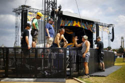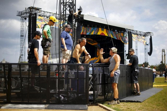 tonnes of equipment such as the stage, speakers, lights and