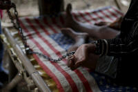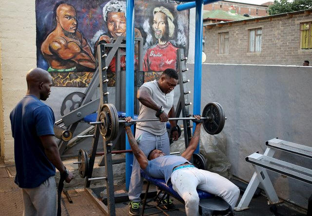 Men lift weight at a township gym in Johannesburg's Alexandra