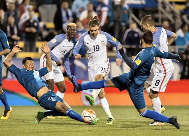 scores his goal while Guatemala goalkeeper Paulo Motta (12) and