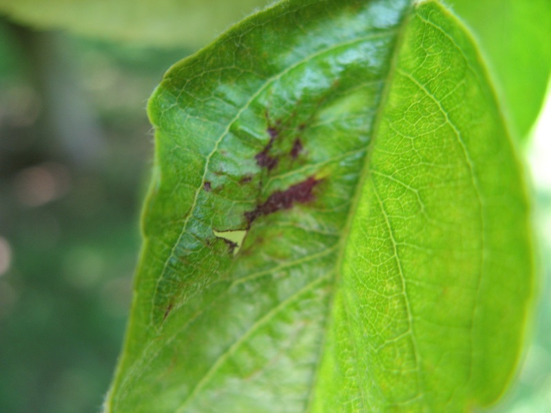 dead leaf areas between leaf veins, or on the tips of leaves.